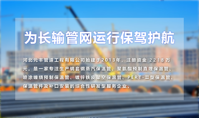 河北元豐管道工程有限公司始建于2013年,注冊資金2218萬元。是一家專注生產(chǎn)鋼套鋼蒸汽保溫管、聚氨酯預制直埋保溫管、噴涂纏繞預制保溫管、鍍鋅鐵皮架空保溫管、PERT-Ⅱ型保溫管、保溫管件及補口安裝的綜合性研發(fā)型服務企業(yè)。